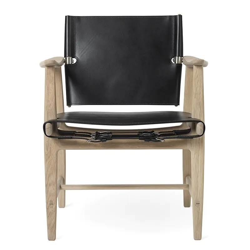 The chair unites two distinct design expressions: simplicity and complexity, resulting in a chaste design with unique details. Presenting a rugged elegance, the stringent design allows the natural and high-quality materials to speak for themselves: The luxurious saddle leather is held taut by buckles and brackets in steel or brass and contrasted by a solid wood frame. The design makes for a flexible and comfortable chair that allows for a variety of sitting positions.