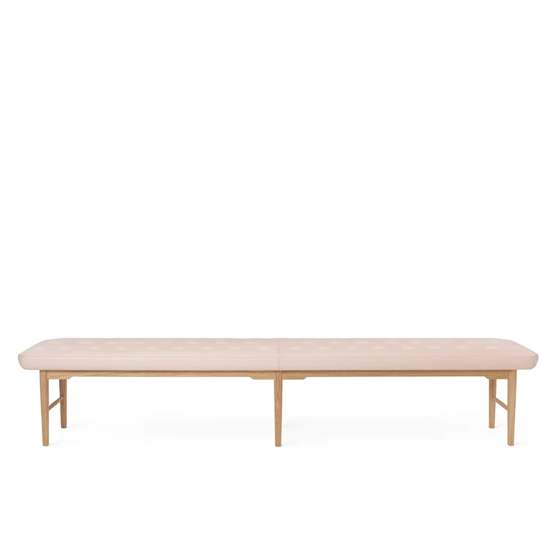 One of three furniture pieces created in 1945 by Vilhelm Lauritzen, the Foyer Bench was initially designed for Copenhagen’s Radiohuset, which today houses the Royal Danish Academy of Music. Simple in its expression, the bench holds an upholstered cushion with handmade buttons on its solid oak frame. Adapted in length and comfort to present-day needs, the beauty of its original design remains now and for generations to come.