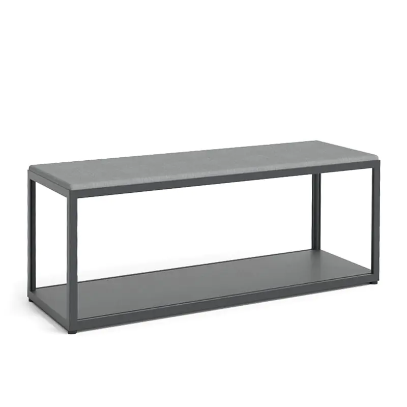 New Order Bench Combination 100 offers a flexible and aesthetic seating and storage solution for hallways in homes or offices. The top surface comes in a variety of fabric and leather options, and provides an extra seat or can be to display and organise objects, while providing easy access from all sides. Both the aluminium grid and top surface are available in different colour options.