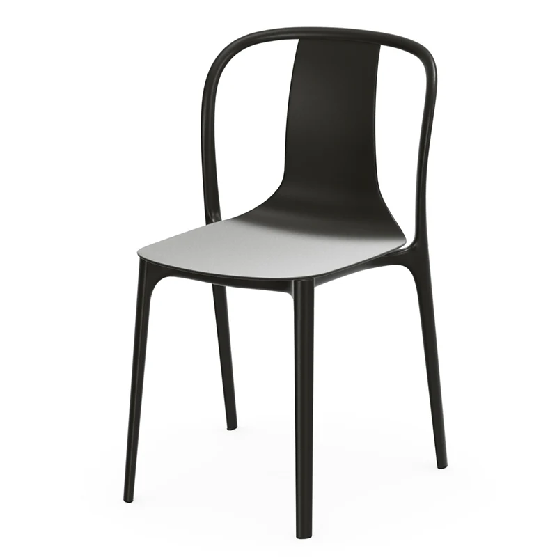 The Belleville Chair is a technically sophisticated plastic chair consisting of two components - a structural frame and a seat shell. Tracing the calligraphic lines of the legs and back, the slender black frame supports a thin shell that tapers from the wide seat surface into a narrow backrest. This type of construction opens up new perspectives for the materiality of the plastic chair, since the surface of the eat shell is the defining characteristic of the Belleville Chair's identity: available in coloured polyamide, moulded plywood veneer or with a cover in leather or fabric, the perception of the Belleville Chair is transformed from a plastic chair to a wooden chair to an upholstered chair - and even to an armchair with forward slanting armrests.