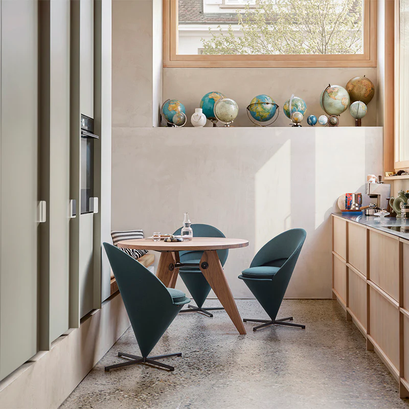 Few chairs announce themselves quite like the Cone. Designed in 1958, it arrived as a provocation — an inverted funnel balanced on a slender four-star steel base, upholstered from base to backrest, with no conventional frame in sight. It was the first full expression of Verner Panton's design language, and it remains one of the most recognisable silhouettes in twentieth-century furniture.