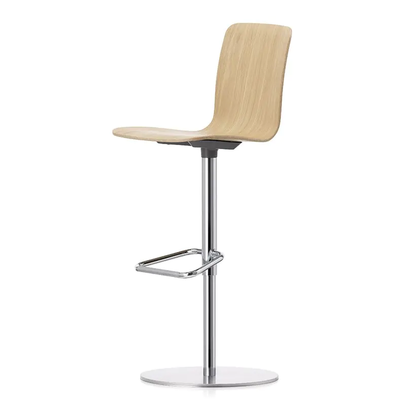 The swivel-mounted HAL Ply Barstool features gas spring-assisted height adjustment for seating at tables and counters from 90 to 110 cm tall, along with additional shock-absorbing seat suspension to ensure dynamic comfort. The seat shell is made of high-quality, easy-to-clean plywood, while the column sleeve, footrest and base plate with a brushed stainless steel cover are manufactured from steel. HAL Ply Barstool is suited not just to bars and restaurants but also to offices with standing-height meeting tables or desks