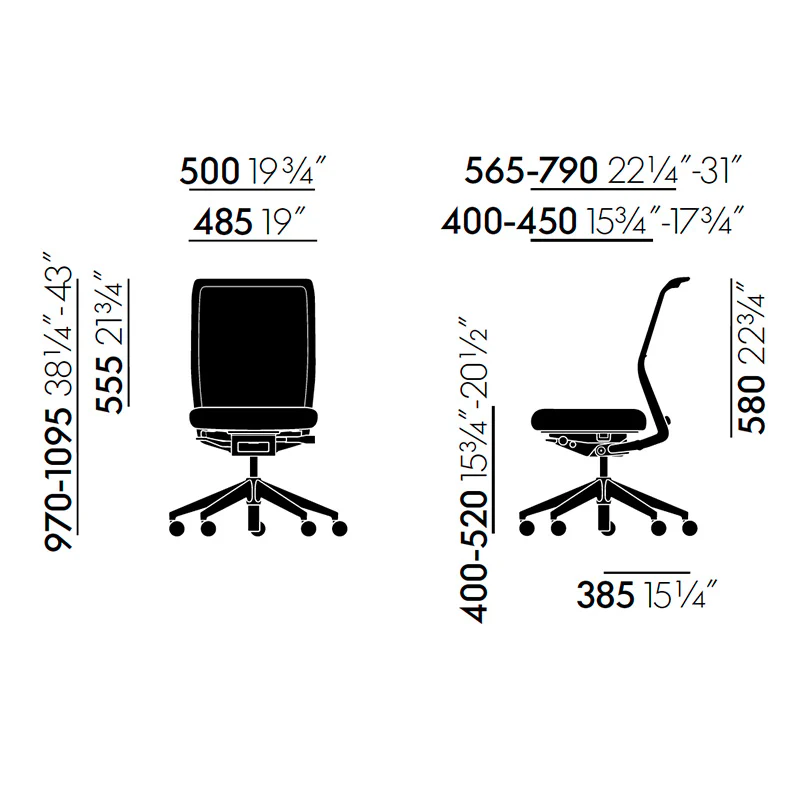 Conference version: conference chair with die-cast polished aluminium 4-star (swivel) base on castors conforming to the EN 13761 standard. With ProMatic mechanism that automatically adjusts the chair to the user’s weight (without forward tilt or height-adjustable seat depth) and fixed seat height and seat-depth cushioning.
