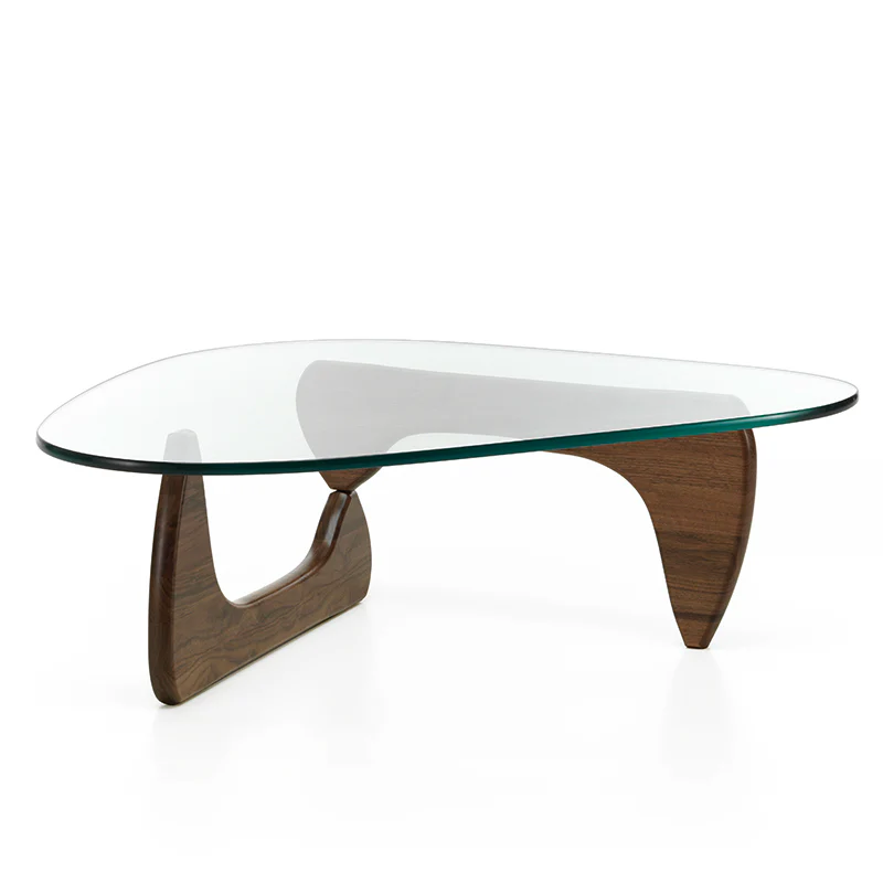 Noguchi himself described the Coffee Table as his best furniture design — no doubt because it is extremely reminiscent of his bronze and marble sculptures of the time, translating their biomorphic formal language unadulterated into a piece of sculptural furniture: a glass table top resting on two identical wooden elements placed at right angles.
